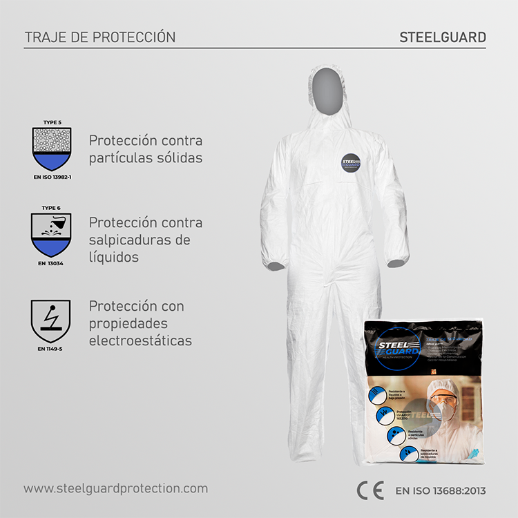 STEEL GUARD ha sido fabricado con una tela no tejida laminada con una película microporosa. Este material de dos capas consta de una capa interior de tela no tejida de polipropileno y una capa exterior de película de polietileno microporoso, creando una excelente barrera protectora. Asimismo, cuenta con capucha, cintura, puños y tobillos elásticos; y la cremallera frontal está bien cubierta por una solapa para evitar partículas.